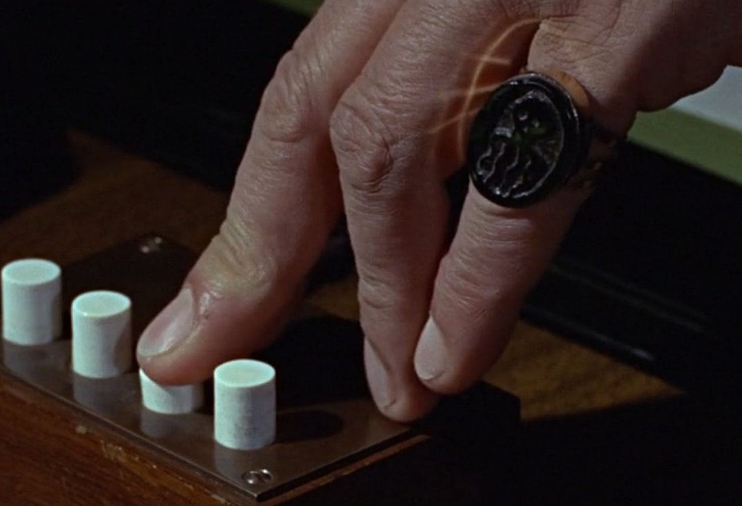 In the scene below, James Bond grabs Madeleine’s wrist. Unbeknownst to James Bond, she is in horror that this has happened as she fears that she has now killed James Bond due to the poison that is on her wrist.