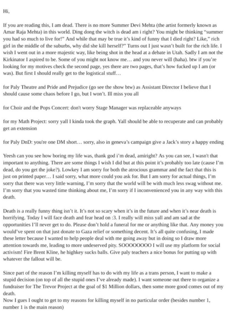 If you are reading this, I am dead. There is no more Summer Devi Mehta (the artist formerly known as Amar Raja Mehta) in this world. Ding dong the witch is dead am i right? You might be thinking “summer you had so much to live for!” And while that may be true it’s kind of funny that I died right? Like,” rich girl in the middle of the suburbs, why did she kill herself?” Turns out I just wasn’t built for the rich life. I wish I went out in a more majestic way, like being shot in the head at a debate in Utah. Sadly I am not the Kirkinator I aspired to be. Some of you might not know me... and you never will (haha). btw if you’re looking for my motives check the second page, yes there are two pages, that’s how fucked up I am (or was). But first I should really get to the logistical stuff...