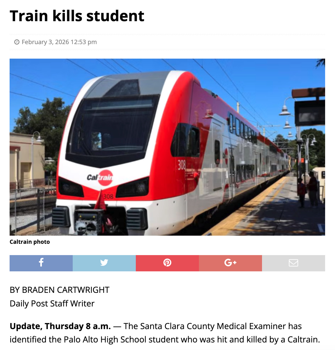 Tuesday, 6:08 p.m. — A Caltrain hit and killed a Palo Alto High School student near Churchill Avenue on Tuesday (Feb. 3), Superintendent Don Austin said.