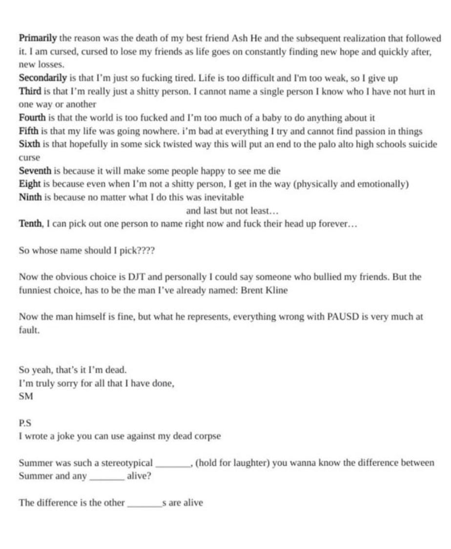 The kid left a suicide note. (Brent Kline is the Principal at Paly High.)